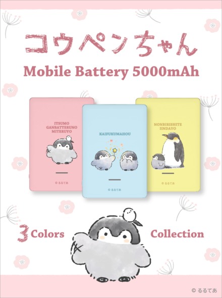 本体⾊は3⾊(ベビーブルー/レモンイエロー/チェリーブロッサム)の展開です。モバイルバッテリー本体中央部にそれぞれ(コウペンちゃん、コウペンちゃんと⼤⼈のペンギンさん、コウペンちゃんと邪エナガさん)のキャラクターと、上部に「KAIFUKUMAHOU」「NONBIRISHITE IINDAYO」「ITSUMO GANBATTERUNO MITERUYO」のテキストをそれぞれあしらいました。