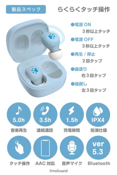 当社では「mofusand」の完全ワイヤレスイヤホンは「SQ-BS37W」シリーズ(2022年12月発売)に続き第2弾となります。