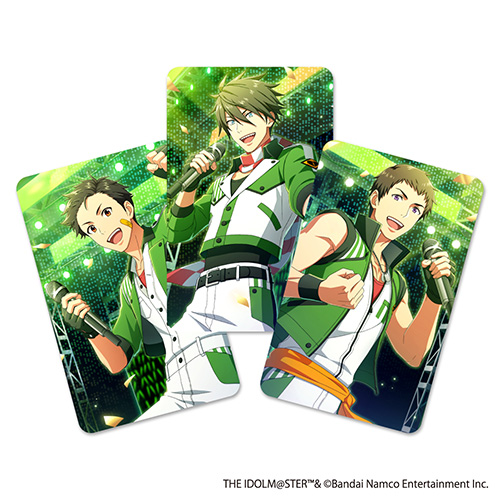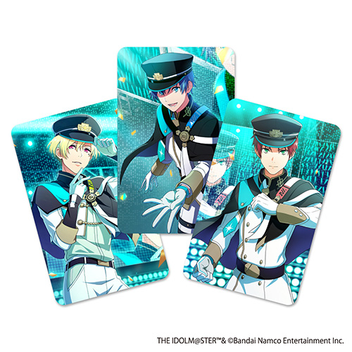 非売品スペシャルホログラムカード3枚のイメージ。クレジットカードサイズでお財布などにも収納できる便利サイズ。左より、「完全ワイヤレスイヤホンアイドルマスター SideM C.FIRST」(BN-BS70W-CF)、「完全ワイヤレスイヤホンアイドルマスター SideM FRAME」(BN-BS70W-FR)