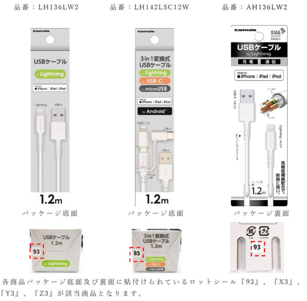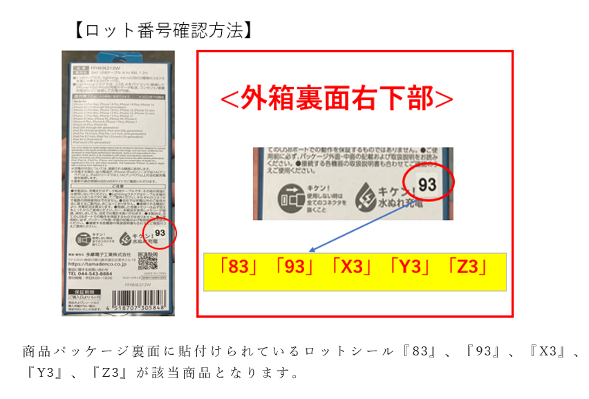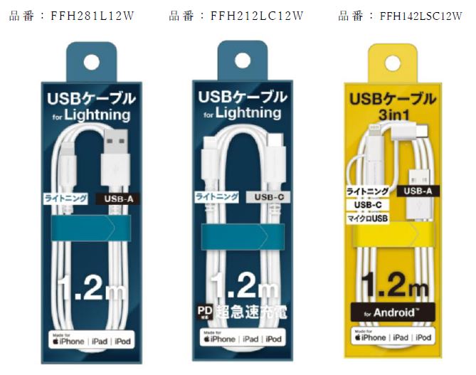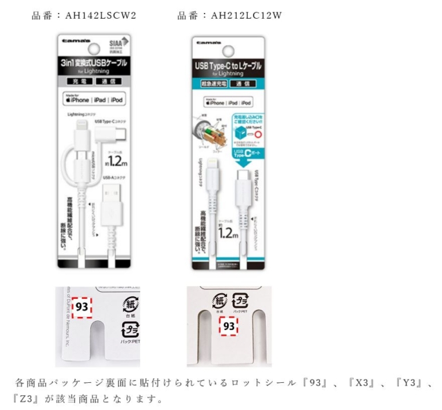 この度、弊社にて製造、販売しております充電通信ケーブルにつきまして、一部の商品においてケーブル表記長1.2mのところ1mの物が混在されていることが確認されました。商品の品質自体には問題ございませんが、該当商品を回収させていただく事になりました。該当商品をお買い求めのお客さまをはじめ、関係者の皆さまには多大なるご迷惑をおかけしますことを深くお詫び申し上げます。