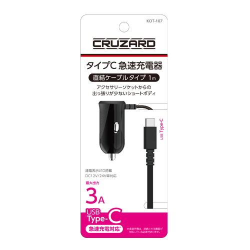 急速充電器 KOT-107 タイプC 急速充電器 直結ケーブルタイプ 1m ●車で簡単にUSB Type-C接続のスマートフォン・タブレットを充電できる直結ケーブルタイプの車載充電器。 ●最大出力3Aの高出力でタブレット充電やスマートフォンの急速充電に対応。 ●トラックなどでも使用できるDC12V・24V対応。 取扱説明書ダウンロード 購入する 法人様向け製品問い合わせフォーム SKU・ KOT-107 Categories: ALL, カタログ, カーチャージャー, カーチャージャー (ケーブル付き), カー用品, 製品カタログ(c_c 2025~) tama's 購入予定から削除購入予定に追加 Share