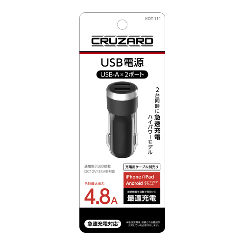 急速充電器 KOT-111 USB電源 USB-A×2ポート ●車のアクセサリーソケットでスマートフォン・タブレットなどを充電。 ●2ポート合計最大4.8A(1ポート最大2.4A)の出力でスマートフォンを2台同時に急速充電可能 ●トラックなどでも使用できる、DC12V/24V 取扱説明書ダウンロード 購入する 法人様向け製品問い合わせフォーム SKU・ KOT-111 Categories: ALL, カタログ, カーチャージャー, カーチャージャー, カー用品, 製品カタログ(c_c 2025~) tama's 購入予定から削除購入予定に追加 Share