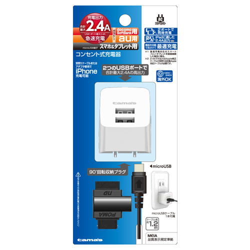 家庭用コンセントでスマートフォン・タブレットを充電できるAC充電器。 2ポート合計最大2.4Aの高出力(1ポート最大2.4A)。スマートフォンの急速充電に対応。 最適充電:iPhone/iPad/スマートフォン/タブレットをICが自動で見分けて、最適な電流で充電をおこないます。 microUSBケーブル 約1.2m microUSBコネクタをFOMA/au/SoftBank ケータイ用コネクタに変換するアダプタ付属