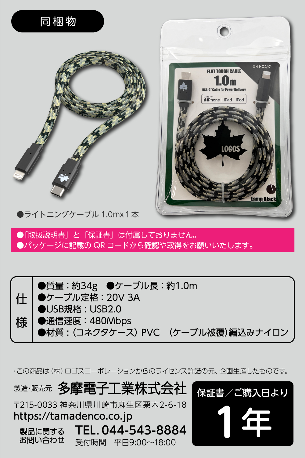 ●ケーブル定格 : 20V 3A