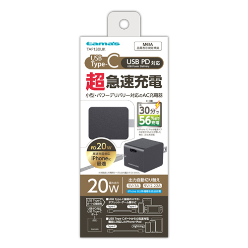 最大20WのUSB PD(パワーデリバリー)に対応したコンセント充電器。