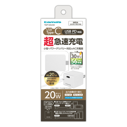 充電器 TAP130UW PD20W コンセントチャージャー 最大20WのUSB PD(パワーデリバリー)に対応したコンセント充電器。 Type-Cポート×1のコンパクトで持ち運びに便利なモデル。 海外でも使える100V〜240V対応。※国や地域によって市販の変換プラグが必要になる場合があります。 取扱説明書ダウンロード 適合表 購入する 法人様向け製品問い合わせフォーム SKU・ TAP130UW Categories: ALL, PD(パワーデリバリー対応), USB 充電器 (PD 対応), その他, カタログ, 充電器, 製品カタログ(c_c 2025~) tama's 購入予定から削除購入予定に追加 Share