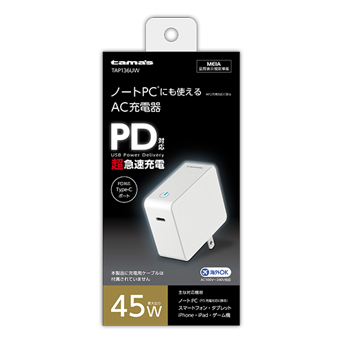 充電器 TAP136UW PD45W コンセントチャージャー ●最大45WのUSB PD対応 USB Type-Cポートを搭載したAC充電器。 ●過電流・過電圧保護機能を搭載した安全設計。 ●90°回転式ACプラグ採用で収納、持ち運びに便利。 ●海外でも使用できるAC100V〜240V対応。 ※国や地域によって市販の変換プラグが必要になる場合があります。 取扱説明書ダウンロード 適合表 購入する 法人様向け製品問い合わせフォーム SKU・ TAP136UW Categories: ALL, PD(パワーデリバリー対応), USB 充電器 (PD 対応), その他, カタログ, 充電器, 製品カタログ(c_c 2025~) tama's 購入予定から削除購入予定に追加 Share