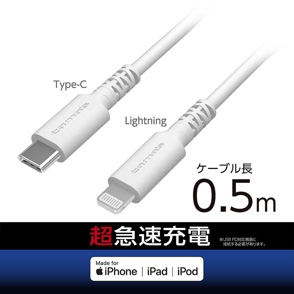 充電器 ケーブル TH212LC05W C to Lケーブル 0.5m ●iPhone/iPad/iPodの、最大60Wの高速充電やデータ転送が可能なUSB PD(Power Delivery)に対応のC to Lケーブル。※USB PD対応機器に接続する必要があります。 ●コネクタの根元を強化、高機能繊維配合で、断線に強い。 取扱説明書ダウンロード 適合表 購入する 法人様向け製品問い合わせフォーム SKU・ TH212LC05W Categories: ALL, USB-C & ライトニング, カタログ, ライトニング, 充電ケーブル, 製品カタログ(c_c 2025~) tama's 購入予定から削除購入予定に追加 Share