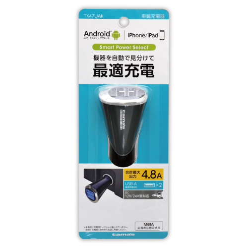 充電器 TK47UAK カーチャージャー4.8A USB2P自動認識 2台同時充電可能な2ポートタイプの車載充電器。 2ポート合計最大充電出力4.8Aの高出力でスマートフォンの急速充電やiPad・タブレットの2台同時充電に対応。 ポートがブルーに光って暗い車内でも使いやすい。 トラックなどでも使用できる、DC12V/24V対応。 ※本製品に充電用ケーブルは付属されていません。接続する機器に合わせて別途ご用意ください。 適合表 購入する 法人様向け製品問い合わせフォーム SKU・ TK47UAK Categories: ALL, カタログ, カーチャージャー, カーチャージャー, カー用品, 製品カタログ(c_c 2025~) tama's 購入予定から削除購入予定に追加 Share