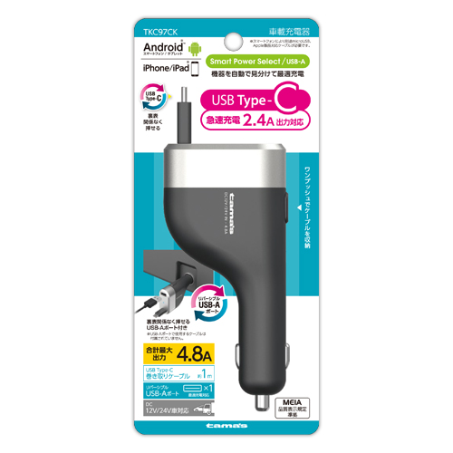 充電器 TKC97CK TypeCカーチャージャーコードリール4.8A 合計最大出力4.8AのType-C急速車載コードリール充電器。 接続機器を自動で見分けて最速充電する「最適充電」搭載。 トラックでも使用できるDC12V/DC24V車対応。 リバーシブルUAB-Aポート付き。 通電表示LED付。 適合表 購入する 法人様向け製品問い合わせフォーム SKU・ TKC97CK Categories: ALL, カタログ, カーチャージャー, カーチャージャー (ケーブル付き), カー用品, 製品カタログ(c_c 2025~) tama's 購入予定から削除購入予定に追加 Share