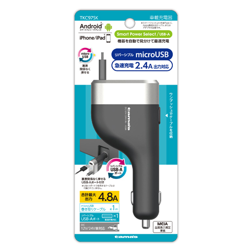 充電器 TKC97SK microUSBカーチャージャーコードリール4.8 合計最大出力4.8AのmicroUAB急速車載コードリール充電器。 接続機器を自動で見分けて最速充電する「最適充電」搭載。 トラックでも使用できるDC12V/DC24V車対応。 リバーシブルUAB-Aポート付き。 通電表示LED付。 適合表 購入する 法人様向け製品問い合わせフォーム SKU・ TKC97SK Categories: ALL, カタログ, カーチャージャー, カーチャージャー (ケーブル付き), カー用品, 製品カタログ(c_c 2025~) tama's 購入予定から削除購入予定に追加 Share