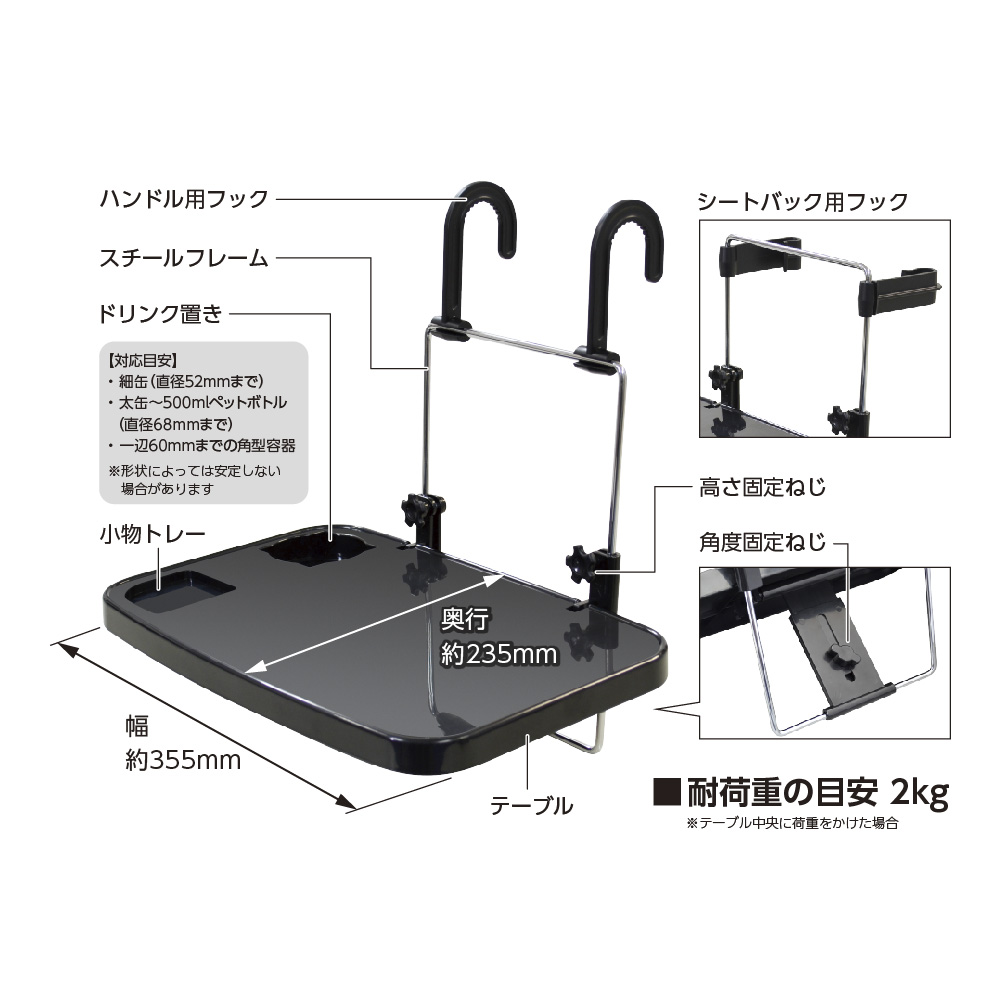 カーアクセサリー TKE01K カーテーブル 運転席で、後部座席で、取り付け簡単テーブル。 仕事の移動の合間、ドライブの休憩時、災害避難時、使いたい時にサッと取り付けできる車用テーブル。 シートバックやハンドルに2通りの取り付け方法。 使わない時はコンパクトに折りたたみ可能。 高さ調整・角度調整対応。 取扱説明書ダウンロード 購入する 法人様向け製品問い合わせフォーム SKU・ TKE01K Categories: ALL, その他, カタログ, カー用品, カー用品その他, 製品カタログ(c_c 2025~) tama's 購入予定から削除購入予定に追加 Share