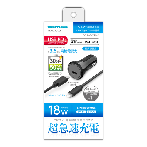 最大18WのUSB PD対応USB Type-Cポート搭載車載充電器。