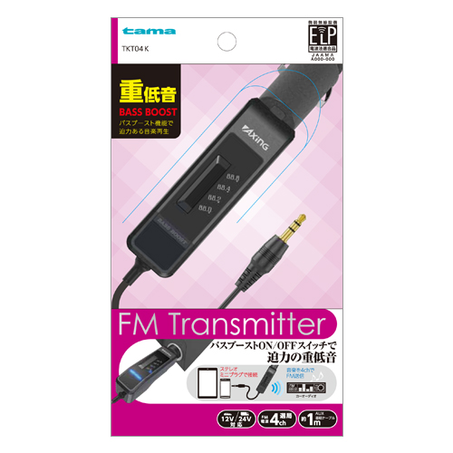 トランスミッター TKT04K FMトランスミッター 4ch バスブースト付 ポータブルオーディオやスマートフォンの音楽をカーFMラジオに送信。手軽に音楽を自動車でお楽しみいただけます。 バスブースト搭載で、迫力ある重低音を3段階で再生。 プッシュ切替式の周波数切替スイッチを採用し、4局の周波数から選択できます。 90°の範囲(22.5°ずつ4段階)で可動するシガープラグ採用で、様々な角度のシガーソケットに対応。 本体に直結した、ストレートタイプケーブル 約1m。 取扱説明書ダウンロード 購入する 法人様向け製品問い合わせフォーム SKU・ TKT04K Categories: ALL, FMトランスミッター, FMトランスミッター, カタログ, カー用品, 製品カタログ(c_c 2025~) tama's 購入予定から削除購入予定に追加 Share