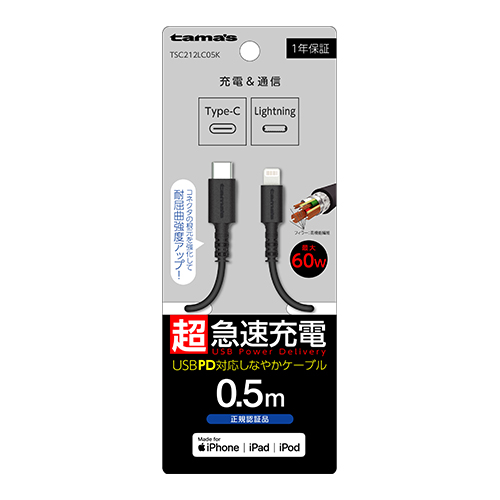 充電 ケーブル TSC212LC05K CtoLロングBケーブル0.5m黒 iPhone/iPad/iPodの充電とデータ転送可能なC to Lightningケーブル。 USB PD(パワーデリバリー)最大60Wの高速充電に対応。※USB PD対応機器に接続する必要があります。 ケーブル長は0.5m コネクタの根元を強化して耐屈曲強度アップ! 適合表 購入する 法人様向け製品問い合わせフォーム SKU・ TSC212LC05K Categories: ALL, カタログ, ライトニング tama's 購入予定から削除購入予定に追加 Share