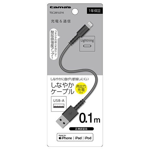 しなやかに曲がり断線しにくいライトニングケーブル0.1m