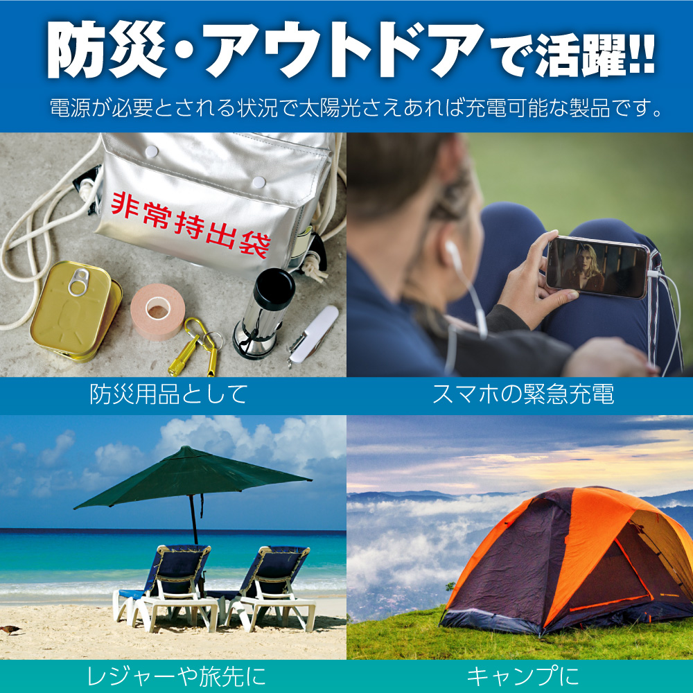 太陽光さえあれば充電可能、防災・アウトドアに便利なソーラー充電器。