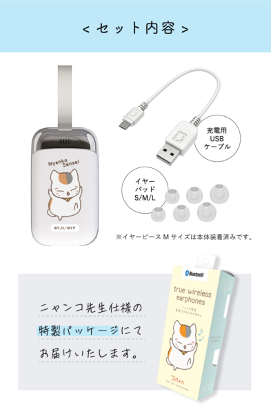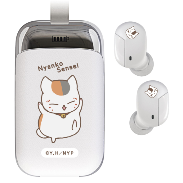 ニャンコ先⽣完全ワイヤレスイヤホンは、イヤホン本体部(左右)と充電クレードル部に夏⽬友⼈帳